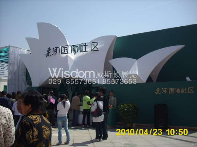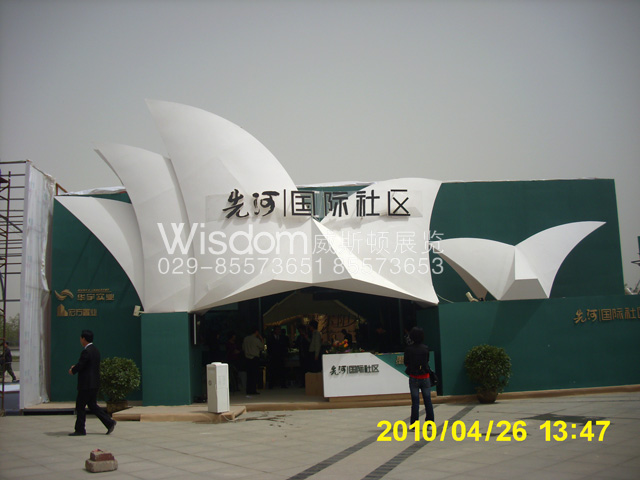 由我公司設(shè)計施工的宏方置業(yè)先河國際社區(qū)展臺,克服下雨刮風等惡劣天氣影響,最終提前完工。此展臺設(shè)計以澳州風情為設(shè)計思想,運用了悉尼歌劇院的造型,現(xiàn)場效果大氣恢宏,具有國際化水準。如同再造了一個悉尼歌劇院,成為此次展會上最閃耀的亮點!現(xiàn)場從房管局領(lǐng)導到客戶到觀從無不對我公司施工工藝大加贊賞!