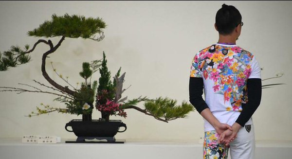 3月14日,花卉師在觀看展品。 新華社記者 呂小煒 攝