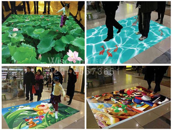 互動(dòng)投影地幕采用先進(jìn)的影像識(shí)別技術(shù),觀眾可以和影像實(shí)時(shí)互動(dòng)。地幕投影在地面地面上,如一走動(dòng),地面上的魚(yú)就游走,伴著水聲,觀眾仿佛真的涉水而過(guò)。或者一揮手,背景上的畫(huà)面就隨著動(dòng)作有變化。